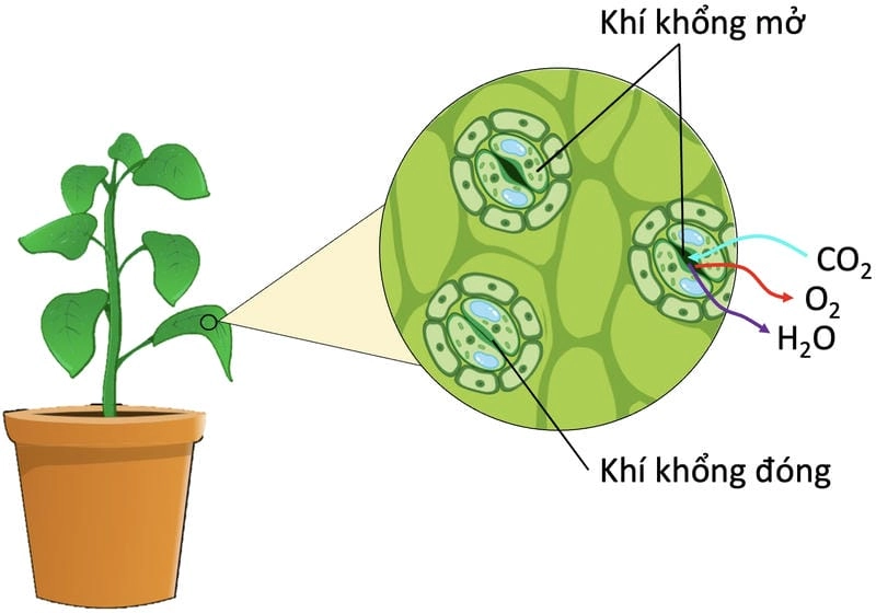 + Hấp thụ CO₂: Khi khí khổng mở, khí carbon dioxide (CO₂) từ không khí sẽ đi vào bên trong lá cây, cung cấp nguyên liệu cho quá trình quang hợp (quá trình tổng hợp đường và oxy dưới tác dụng của ánh sáng).